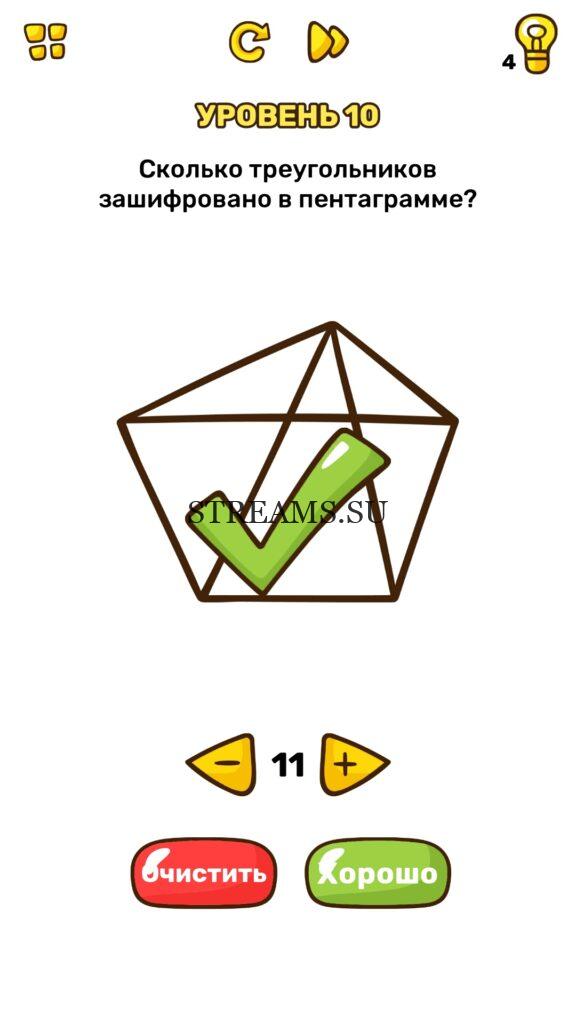 Сколько треугольников зашифровано в пентаграмме? Уровень 10 — Brain Blow: Тест на гениальность — Ответ на этот уровень находится под фото. Очередная игра от популярных разработчиков головоломок CASUAL AZUR GAMES. Если вы хотите взорвать свой мозг и развить навыки нестандартного мышления, тогда игра Брейн Блоу определенно вам понравится. Если не получается решить задание, то попробуйте включить нестандартное мышление, тряхнуть телефон, погладить его или использовать больше пальцев. Эта игра способна развить в вас навыки следопыта, креативность и прокачать ваш IQ. Но, а если все-же не получается пройти уровень, найдите правильное решение на нашем сайте.