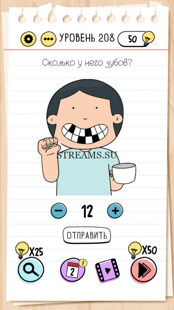 Сколько у него зубов? Уровень 208 — Brain Test — Это самая популярная головоломка, в которой вам предстоит разгадывать непростые задачки. Нужно будет искать нестандартные решения. Название игры говорит само за себя (Тест мозга). С её помощью вы сможете повысить свой IQ, и интеллект. Иногда ответ может быть очень прост. Вы можете играть в компании друзей или родных. Брейн Тест, это отличный способ провести время с пользой и узнать насколько ты умный. Но если вы не можете решить один или несколько уровней, то воспользуйтесь подсказками с нашего сайта.