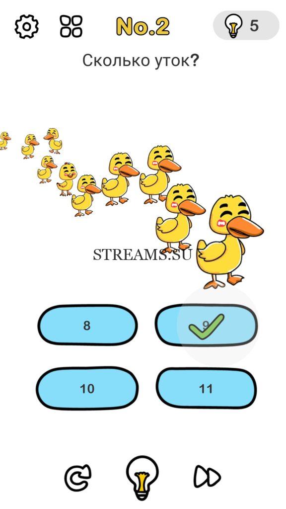 Сколько уток? Уровень 2 — Brain Out: Ответ на этот уровень находится чуть ниже. Всегда было интересно узнать каков твой IQ? Эта игра поможет тебе узнать ответ на этот вопрос! В ней встречаются как логические загадки, так и не очень. С помощью этой интересной головоломки вы сможете развить нестандартное мышление, креативность, воображение а также улучшить способность запоминать. Некоторые решения задач, могут показаться абсурдными. Играйте в Brain Out с друзьями и родственниками. А если у вас не получается пройти один или несколько уровней, вы можете воспользоваться подсказками с нашего сайта.