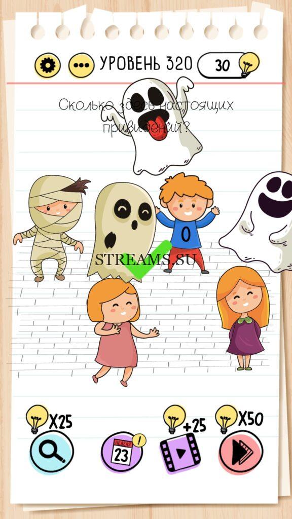Сколько здесь настоящих привидений? Уровень 320 — Brain Test — Это самая популярная головоломка, в которой вам предстоит разгадывать непростые задачки. Нужно будет искать нестандартные решения. Название игры говорит само за себя (Тест мозга). С её помощью вы сможете повысить свой IQ, и интеллект. Иногда ответ может быть очень прост. Вы можете играть в компании друзей или родных. Брейн Тест, это отличный способ провести время с пользой и узнать насколько ты умный. Но если вы не можете решить один или несколько уровней, то воспользуйтесь подсказками с нашего сайта.