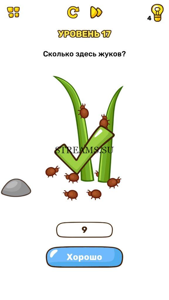 Сколько здесь жуков? Уровень 17 — Brain Blow: Тест на гениальность — Ответ на этот уровень находится под фото. Очередная игра от популярных разработчиков головоломок CASUAL AZUR GAMES. Если вы хотите взорвать свой мозг и развить навыки нестандартного мышления, тогда игра Брейн Блоу определенно вам понравится. Если не получается решить задание, то попробуйте включить нестандартное мышление, тряхнуть телефон, погладить его или использовать больше пальцев. Эта игра способна развить в вас навыки следопыта, креативность и прокачать ваш IQ. Но, а если все-же не получается пройти уровень, найдите правильное решение на нашем сайте.