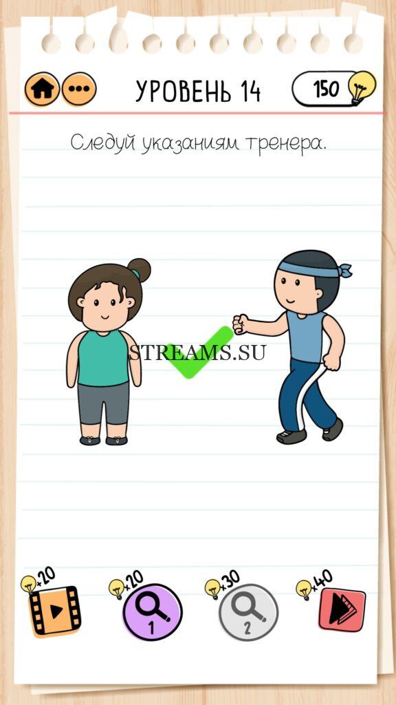 Следуй указаниям тренера. Уровень 14 — Brain Test 2 (Худеем с Настей): Вторая часть замечательной игры уже здесь. Готовы к испытанию своего мозга на прочность? Тогда смело залетайте в эту головоломку. Здесь нас ждет непредсказуемые задачки, вопросы и головоломки, которые сразу и не получиться решить. Будьте готовы к вопросам с подвохом! Попробуйте решить все уровни. Эта головоломка построена по принципу историй. В каждой истории придется помогать кому-то решить бытовые вопросы; вычислить преступника; помочь похудеть. Это лишь некоторые эпизоды которые нас ожидают в этой игре. Очень красочная игра, которая понравится и вам и вашим друзьям. Если не получается пройти загадку, то на нашем сайте STREAMS.SU вы найдете решение любого уровня Brain Test 2!