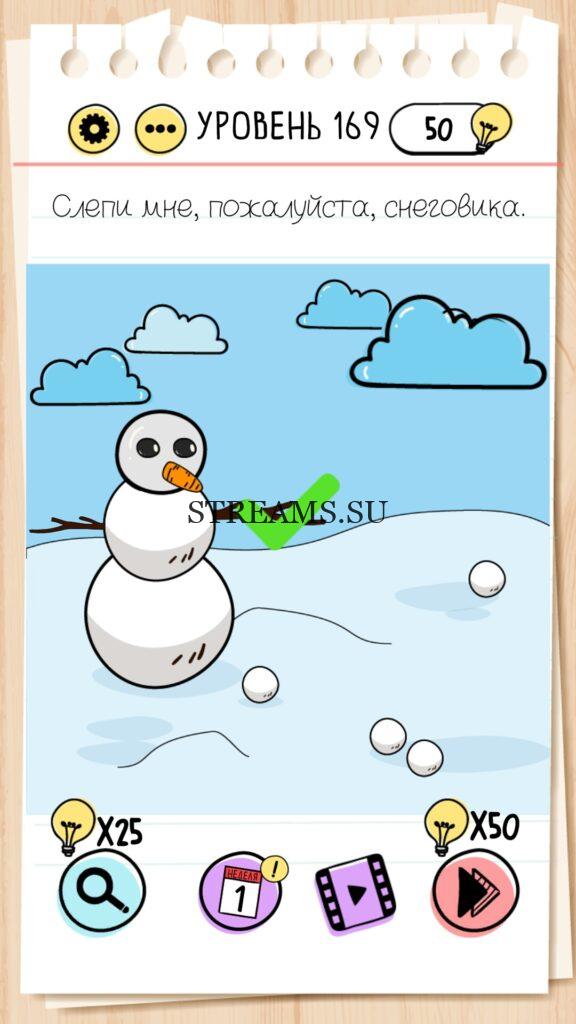 Слепи мне, пожалуйста, снеговика. Уровень 169 — Brain Test— Это самая популярная головоломка, в которой вам предстоит разгадывать непростые задачки. Нужно будет искать нестандартные решения. Название игры говорит само за себя (Тест мозга). С её помощью вы сможете повысить свой IQ, и интеллект. Иногда ответ может быть очень прост. Вы можете играть в компании друзей или родных. Брейн Тест, это отличный способ провести время с пользой и узнать насколько ты умный. Но если вы не можете решить один или несколько уровней, то воспользуйтесь подсказками с нашего сайта.