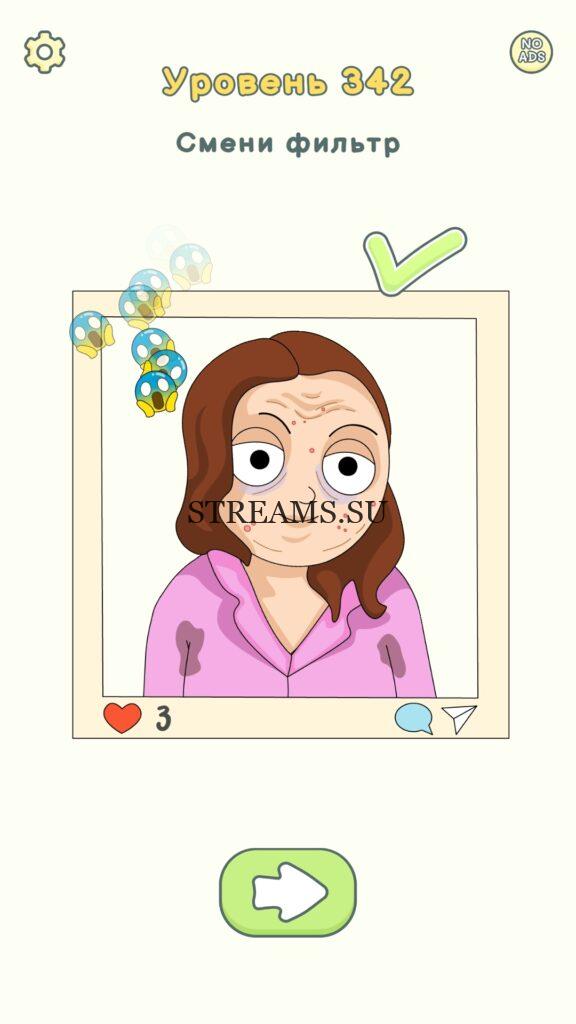 Смени фильтр. Уровень 342 — DOP 2: Delete One Part. Вы готовы к продолжению первой части игры? Тогда вперед! Эта игра DOP 2 (Расшифровка: Delete One Part) , которая отличается от первой части тем, что здесь нам нужно будет не дорисовывать предметы, а удалять или стирать их. Вас ждет множество хитроумных и интересных уровней. На первом этапе нам будут подсказывать, что нужно удали, но потом становится всё тяжелее и тяжелее решать головоломки. Разработчики постарались сделать игру привлекательной. Геймплей заставит вас просидеть за игрой очень долго. Красивая графика исполнения. Тренировка мозга и многое другое, всё это ждет нас в замечательной головоломке DOP 2. Если не получается пройти уровень, или зашли в тупик, то вы можете найти ответ на любой уровень на нашем сайте STREAMS.SU! Ответ на этот уровень находиться чуть ниже..