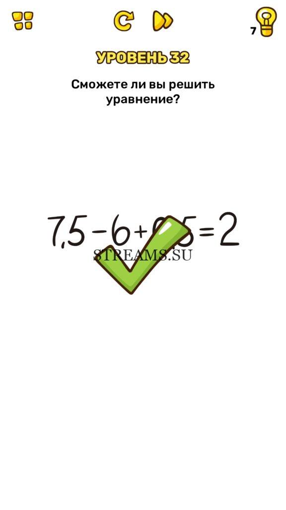 Сможете ли вы решить уравнение? Уровень 32 — Brain Blow: Тест на гениальность — Ответ на этот уровень находится под фото. Очередная игра от популярных разработчиков головоломок CASUAL AZUR GAMES. Если вы хотите взорвать свой мозг и развить навыки нестандартного мышления, тогда игра Брейн Блоу определенно вам понравится. Если не получается решить задание, то попробуйте включить нестандартное мышление, тряхнуть телефон, погладить его или использовать больше пальцев. Эта игра способна развить в вас навыки следопыта, креативность и прокачать ваш IQ. Но, а если все-же не получается пройти уровень, найдите правильное решение на нашем сайте.