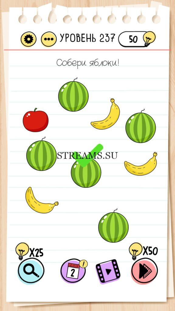 Собери яблоки! Уровень 237 — Brain Test — Это самая популярная головоломка, в которой вам предстоит разгадывать непростые задачки. Нужно будет искать нестандартные решения. Название игры говорит само за себя (Тест мозга). С её помощью вы сможете повысить свой IQ, и интеллект. Иногда ответ может быть очень прост. Вы можете играть в компании друзей или родных. Брейн Тест, это отличный способ провести время с пользой и узнать насколько ты умный. Но если вы не можете решить один или несколько уровней, то воспользуйтесь подсказками с нашего сайта.