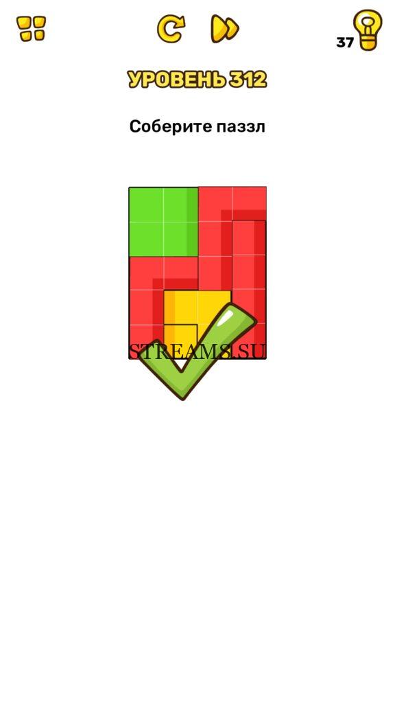 Соберите паззл. Уровень 312 — Brain Blow: Тест на гениальность — Ответ на этот уровень находится под фото. Очередная игра от популярных разработчиков головоломок CASUAL AZUR GAMES. Если вы хотите взорвать свой мозг и развить навыки нестандартного мышления, тогда игра Брейн Блоу определенно вам понравится. Если не получается решить задание, то попробуйте включить нестандартное мышление, тряхнуть телефон, погладить его или использовать больше пальцев. Эта игра способна развить в вас навыки следопыта, креативность и прокачать ваш IQ. Но, а если все-же не получается пройти уровень, найдите правильное решение на нашем сайте.
