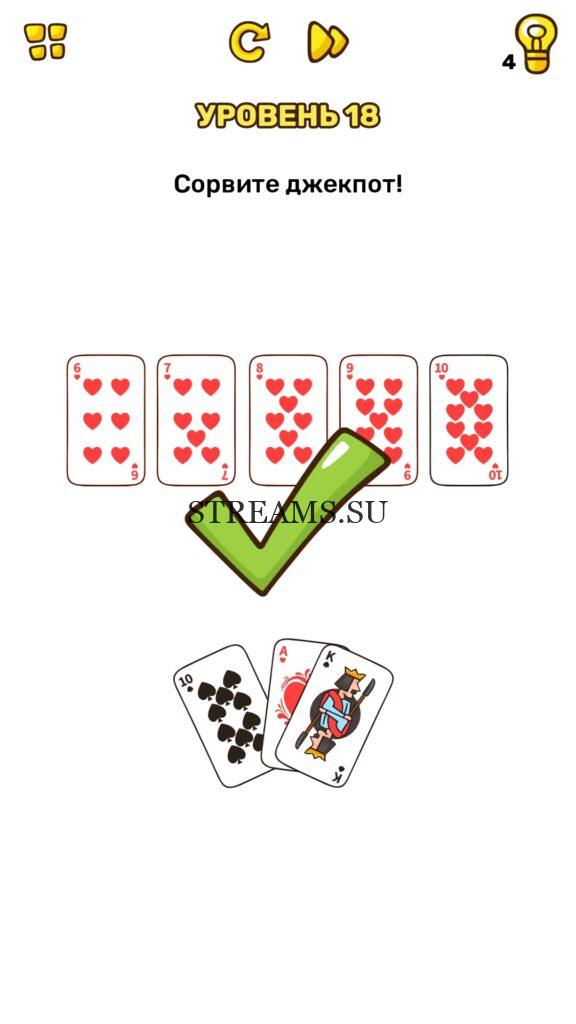 Сорвите джекпот! Уровень 18 — Brain Blow: Тест на гениальность — Ответ на этот уровень находится под фото. Очередная игра от популярных разработчиков головоломок CASUAL AZUR GAMES. Если вы хотите взорвать свой мозг и развить навыки нестандартного мышления, тогда игра Брейн Блоу определенно вам понравится. Если не получается решить задание, то попробуйте включить нестандартное мышление, тряхнуть телефон, погладить его или использовать больше пальцев. Эта игра способна развить в вас навыки следопыта, креативность и прокачать ваш IQ. Но, а если все-же не получается пройти уровень, найдите правильное решение на нашем сайте.