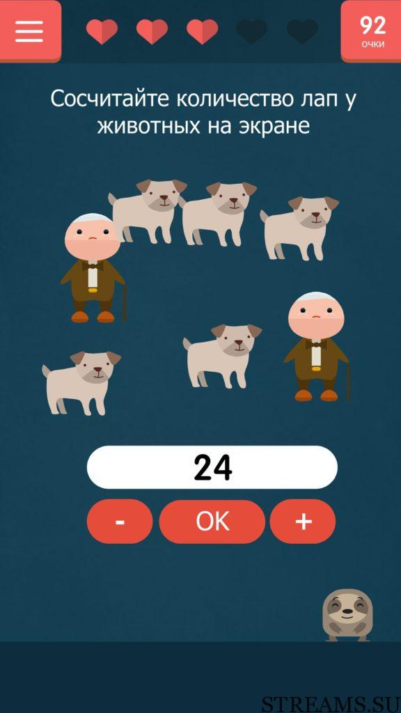 ОТВЕТ: Отодвиньте некоторых собак, тогда вы сможете сосчитать все лапы. Их 24