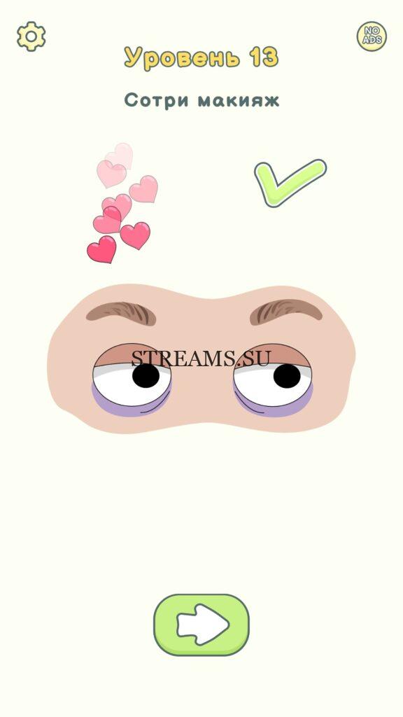 Сотри макияж. Уровень 13 — DOP 2: Delete One Part. Вы готовы к продолжению первой части игры? Тогда вперед! Эта игра DOP 2 (Расшифровка: Delete One Part) , которая отличается от первой части тем, что здесь нам нужно будет не дорисовывать предметы, а удалять или стирать их. Вас ждет множество хитроумных и интересных уровней. На первом этапе нам будут подсказывать, что нужно удали, но потом становится всё тяжелее и тяжелее решать головоломки. Разработчики постарались сделать игру привлекательной. Геймплей заставит вас просидеть за игрой очень долго. Красивая графика исполнения. Тренировка мозга и многое другое, всё это ждет нас в замечательной головоломке DOP 2. Если не получается пройти уровень, или зашли в тупик, то вы можете найти ответ на любой уровень на нашем сайте STREAMS.SU! Ответ на этот уровень находиться чуть ниже..