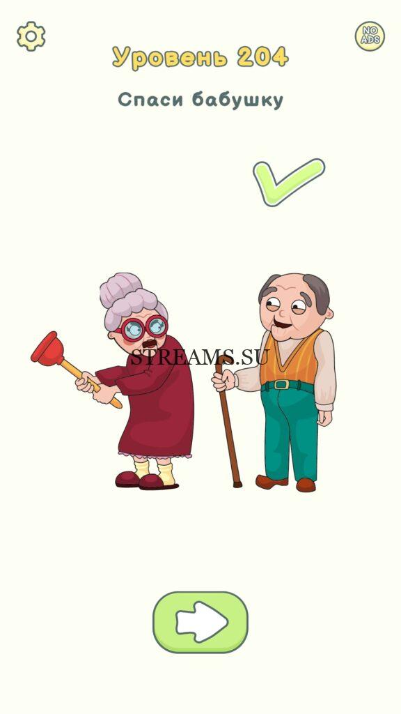 Спаси бабушку. Уровень 204 — DOP 2: Delete One Part. Вы готовы к продолжению первой части игры? Тогда вперед! Эта игра DOP 2 (Расшифровка: Delete One Part) , которая отличается от первой части тем, что здесь нам нужно будет не дорисовывать предметы, а удалять или стирать их. Вас ждет множество хитроумных и интересных уровней. На первом этапе нам будут подсказывать, что нужно удали, но потом становится всё тяжелее и тяжелее решать головоломки. Разработчики постарались сделать игру привлекательной. Геймплей заставит вас просидеть за игрой очень долго. Красивая графика исполнения. Тренировка мозга и многое другое, всё это ждет нас в замечательной головоломке DOP 2. Если не получается пройти уровень, или зашли в тупик, то вы можете найти ответ на любой уровень на нашем сайте STREAMS.SU! Ответ на этот уровень находиться чуть ниже..