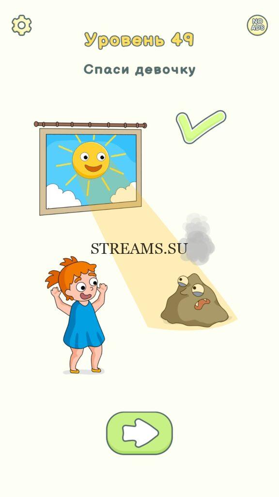 Спаси девочку. Уровень 49 — DOP 2: Delete One Part. Вы готовы к продолжению первой части игры? Тогда вперед! Эта игра DOP 2 (Расшифровка: Delete One Part) , которая отличается от первой части тем, что здесь нам нужно будет не дорисовывать предметы, а удалять или стирать их. Вас ждет множество хитроумных и интересных уровней. На первом этапе нам будут подсказывать, что нужно удали, но потом становится всё тяжелее и тяжелее решать головоломки. Разработчики постарались сделать игру привлекательной. Геймплей заставит вас просидеть за игрой очень долго. Красивая графика исполнения. Тренировка мозга и многое другое, всё это ждет нас в замечательной головоломке DOP 2. Если не получается пройти уровень, или зашли в тупик, то вы можете найти ответ на любой уровень на нашем сайте STREAMS.SU! Ответ на этот уровень находиться чуть ниже..