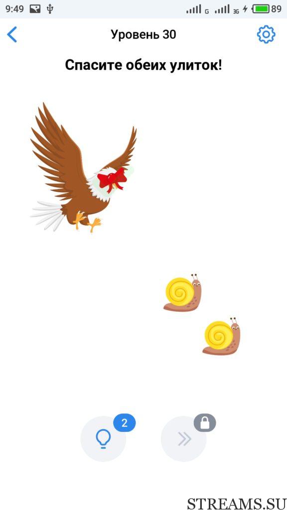 Спаси обеих улиток! 30 уровень Easy Game — это интересная но в тоже время сложная головоломка, которая заставит вас включить нестандартное мышление. Прокачайте свой мозг и IQ. Почувствуйте себя самым умным, решая захватывающие и заковыристые задачки. Разработчики Easybrain, обещают, что с помощью этой игры вы сможете развить творческие навыки. Но если не сможете пройти какой-нибудь из уровней, то воспользуйтесь ответами с нашего сайта.