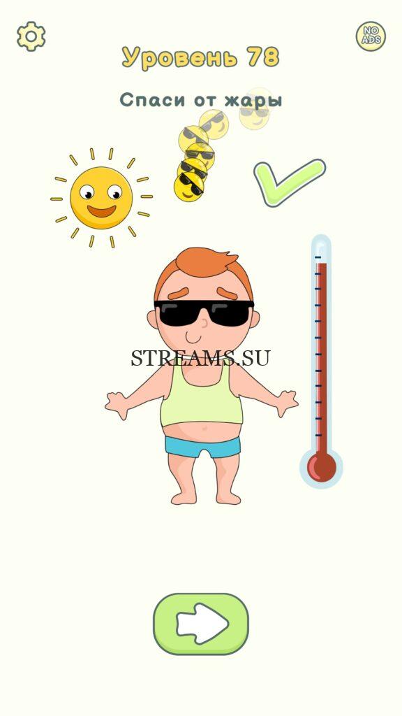 Спаси от жары. Уровень 78 — DOP 2: Delete One Part. Вы готовы к продолжению первой части игры? Тогда вперед! Эта игра DOP 2 (Расшифровка: Delete One Part) , которая отличается от первой части тем, что здесь нам нужно будет не дорисовывать предметы, а удалять или стирать их. Вас ждет множество хитроумных и интересных уровней. На первом этапе нам будут подсказывать, что нужно удали, но потом становится всё тяжелее и тяжелее решать головоломки. Разработчики постарались сделать игру привлекательной. Геймплей заставит вас просидеть за игрой очень долго. Красивая графика исполнения. Тренировка мозга и многое другое, всё это ждет нас в замечательной головоломке DOP 2. Если не получается пройти уровень, или зашли в тупик, то вы можете найти ответ на любой уровень на нашем сайте STREAMS.SU! Ответ на этот уровень находиться чуть ниже..