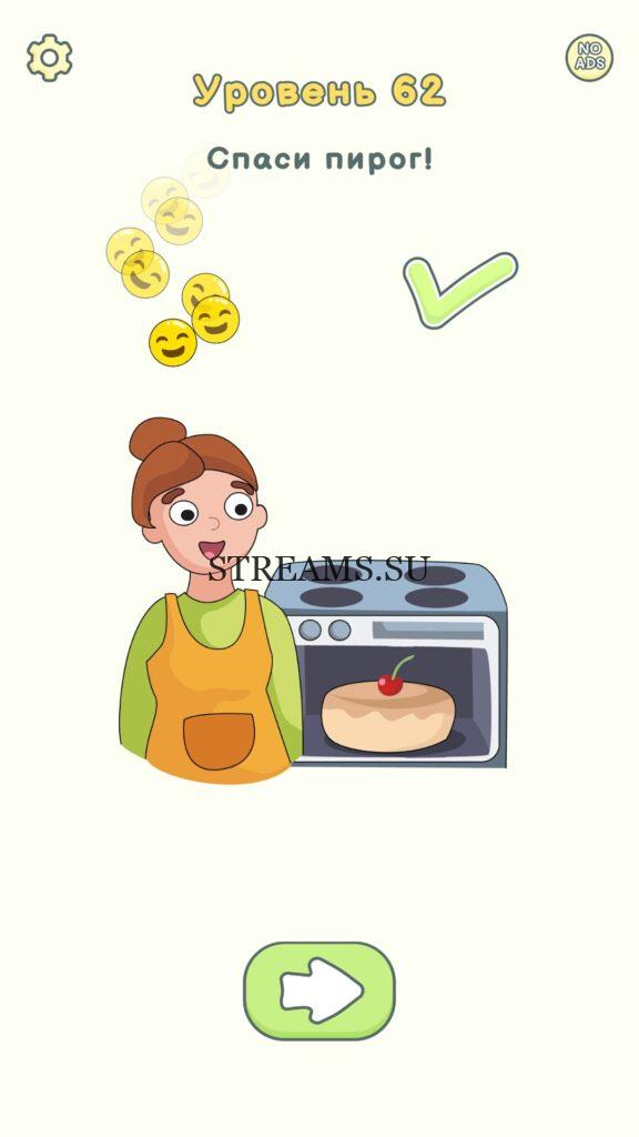 Спаси пирог! Уровень 62 — DOP 2: Delete One Part. Вы готовы к продолжению первой части игры? Тогда вперед! Эта игра DOP 2 (Расшифровка: Delete One Part) , которая отличается от первой части тем, что здесь нам нужно будет не дорисовывать предметы, а удалять или стирать их. Вас ждет множество хитроумных и интересных уровней. На первом этапе нам будут подсказывать, что нужно удали, но потом становится всё тяжелее и тяжелее решать головоломки. Разработчики постарались сделать игру привлекательной. Геймплей заставит вас просидеть за игрой очень долго. Красивая графика исполнения. Тренировка мозга и многое другое, всё это ждет нас в замечательной головоломке DOP 2. Если не получается пройти уровень, или зашли в тупик, то вы можете найти ответ на любой уровень на нашем сайте STREAMS.SU! Ответ на этот уровень находиться чуть ниже..