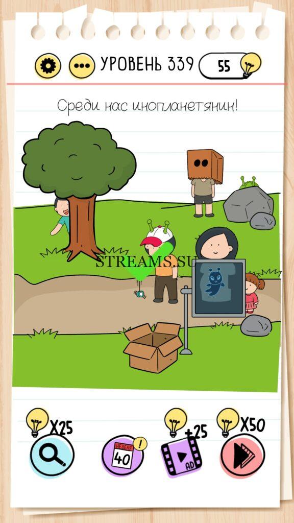Среди нас инопланетянин! Уровень 339 — Brain Test — Это самая популярная головоломка, в которой вам предстоит разгадывать непростые задачки. Нужно будет искать нестандартные решения. Название игры говорит само за себя (Тест мозга). С её помощью вы сможете повысить свой IQ, и интеллект. Иногда ответ может быть очень прост. Вы можете играть в компании друзей или родных. Брейн Тест, это отличный способ провести время с пользой и узнать насколько ты умный. Но если вы не можете решить один или несколько уровней, то воспользуйтесь подсказками с нашего сайта.
