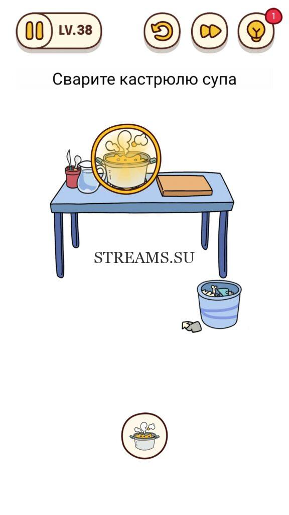 Сварите кастрюлю супа. Уровень 38 — Brain Find – игра для любителей подумать над интересными задачами, ответ на этот уровень находится чуть ниже. Нужно включить собственное остроумие. Эта игра дает возможность увидеть множество локаций и разгадать бесконечное количество ребусов. Каждый отличается друг от друга. Создатели игры – «Focus apps» вложили не только материальные средства, но и всю любовь к игрокам. Ведь в приложении достаточно совершенная прорисовка, радующая глаз. Главным преимуществом является поддержка как Android так и IOS. Нередко бывает, что человек, проходящий уровень, не способен его решить (задача слишком сложна или непонятна). Наш сайт с ответами поможет игроку достичь вершин рейтинга и заполучить все бонусы.