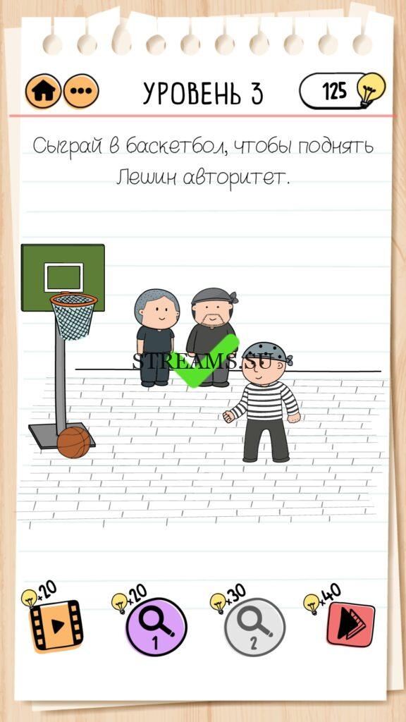 Сыграй в баскетбол, чтобы поднять Лешин авторитет. Уровень 3 — Brain Test 2 (Побег из тюрьмы): Вторая часть замечательной игры уже здесь. Готовы к испытанию своего мозга на прочность? Тогда смело залетайте в эту головоломку. Здесь нас ждет непредсказуемые задачки, вопросы и головоломки, которые сразу и не получиться решить. Будьте готовы к вопросам с подвохом! Попробуйте решить все уровни. Эта головоломка построена по принципу историй. В каждой истории придется помогать кому-то решить бытовые вопросы; вычислить преступника; помочь похудеть. Это лишь некоторые эпизоды которые нас ожидают в этой игре. Очень красочная игра, которая понравится и вам и вашим друзьям. Если не получается пройти загадку, то на нашем сайте STREAMS.SU вы найдете решение любого уровня Brain Test 2!