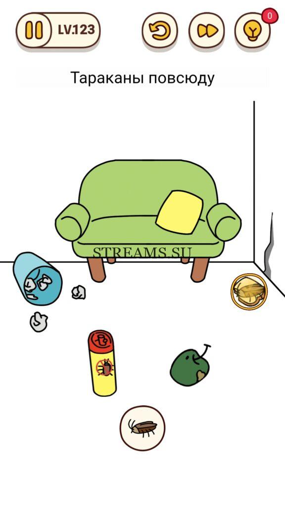 Тараканы повсюду. Уровень 123 — Brain Find– уникальная игра в жанре «головоломка», ответ находится чуть ниже. Она имеет множество уровней и подуровней, которые весело проходить, без особых усилий и траты нервов. Игра нравится многим пользователям из-за приятного музыкального ряда, сопровождающегося весь игровой процесс. Тонко выполненной анимации и красивой графики, над которой поработали разработчики и вложили душу. Уникальность проекта состоит в том, что можно поворачивать экран на некоторых заданиях, увеличивать громкость динамика. То есть, всецело взаимодействовать не только с дисплеем, но и со всем мобильным устройством. На данный момент таких игр мало и не все они доступны в бесплатной версии! Brain Find переведена на русский язык. На нашем сайте, можно получить подсказки, если не получается пройти дальше.