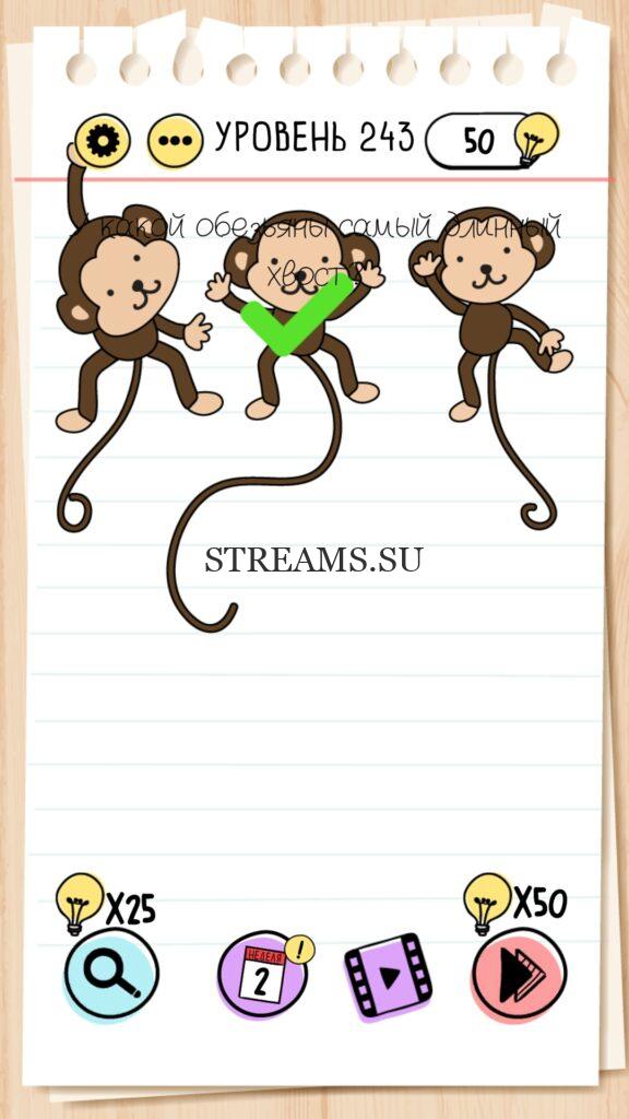 У какой обезьяны самый длинный хвост? Уровень 243 — Brain Test — Это самая популярная головоломка, в которой вам предстоит разгадывать непростые задачки. Нужно будет искать нестандартные решения. Название игры говорит само за себя (Тест мозга). С её помощью вы сможете повысить свой IQ, и интеллект. Иногда ответ может быть очень прост. Вы можете играть в компании друзей или родных. Брейн Тест, это отличный способ провести время с пользой и узнать насколько ты умный. Но если вы не можете решить один или несколько уровней, то воспользуйтесь подсказками с нашего сайта.