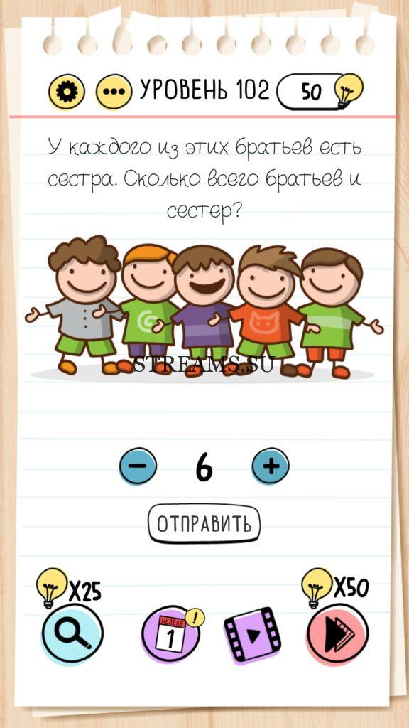 У каждого из этих братьев есть сестра. Сколько всего братьев и сестер? Уровень 102 — Brain Test — Это самая популярная головоломка, в которой вам предстоит разгадывать непростые задачки. Нужно будет искать нестандартные решения. Название игры говорит само за себя (Тест мозга). С её помощью вы сможете повысить свой IQ, и интеллект. Иногда ответ может быть очень прост. Вы можете играть в компании друзей или родных. Брейн Тест, это отличный способ провести время с пользой и узнать насколько ты умный. Но если вы не можете решить один или несколько уровней, то воспользуйтесь подсказками с нашего сайта.