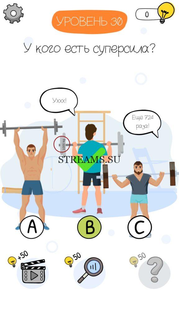 У кого есть суперсила? Уровень 30 — Who is? Головоломки и загадки — это уникальная головоломка, с которой не соскучишься! Если вам понравились такие игры как Brain Test и вторая её часть, то вам придется по вкусу и эта игра. С помощью подсказок, которые нам предстоит найти, нужно проходить уровень за уровнем. С каждым уровнем сложность отгадки будет расти. Поэтому приготовьтесь попотеть, чтобы пройти все уровни. Преимущества этой игры в том, что она работает без интернета! Если у вас не получается пройти один из уровней, то не отчаивайтесь. Вы всегда сможете найти ответы к игре Who is? на нашем замечательном сайте!