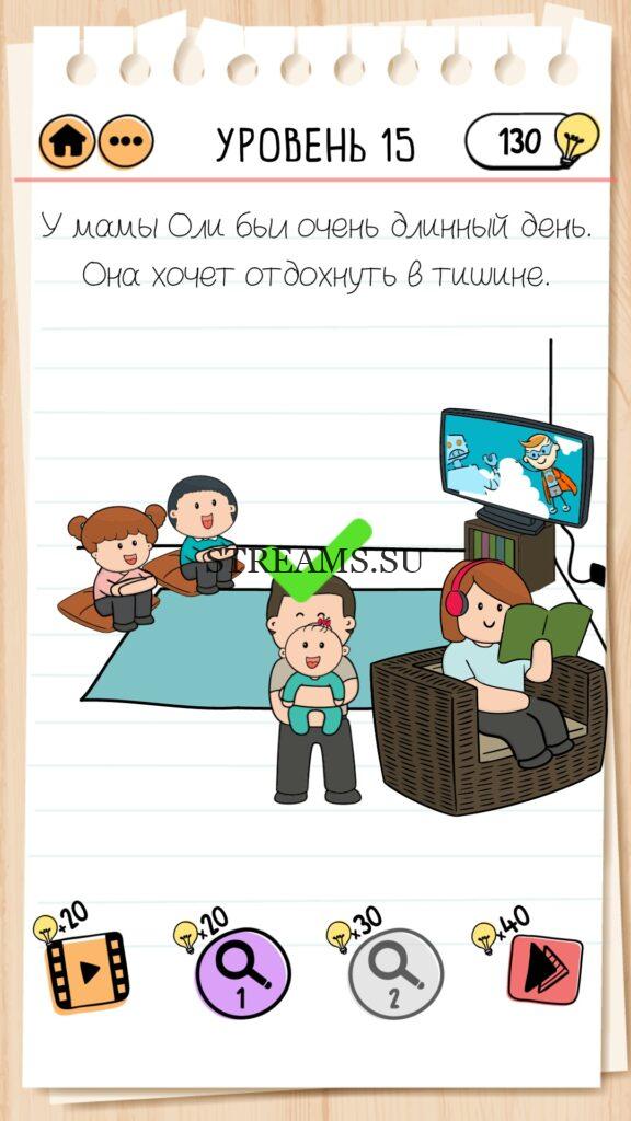 У мамы Оли был очень длинный день. Она хочет отдохнуть в тишине! Уровень 15 — Brain Test 2 (Семья Всезнайкиных): Вторая часть замечательной игры уже здесь. Готовы к испытанию своего мозга на прочность? Тогда смело залетайте в эту головоломку. Здесь нас ждет непредсказуемые задачки, вопросы и головоломки, которые сразу и не получиться решить. Будьте готовы к вопросам с подвохом! Попробуйте решить все уровни. Эта головоломка построена по принципу историй. В каждой истории придется помогать кому-то решить бытовые вопросы; вычислить преступника; помочь похудеть. Это лишь некоторые эпизоды которые нас ожидают в этой игре. Очень красочная игра, которая понравится и вам и вашим друзьям. Если не получается пройти загадку, то на нашем сайте STREAMS.SU вы найдете решение любого уровня Brain Test 2!