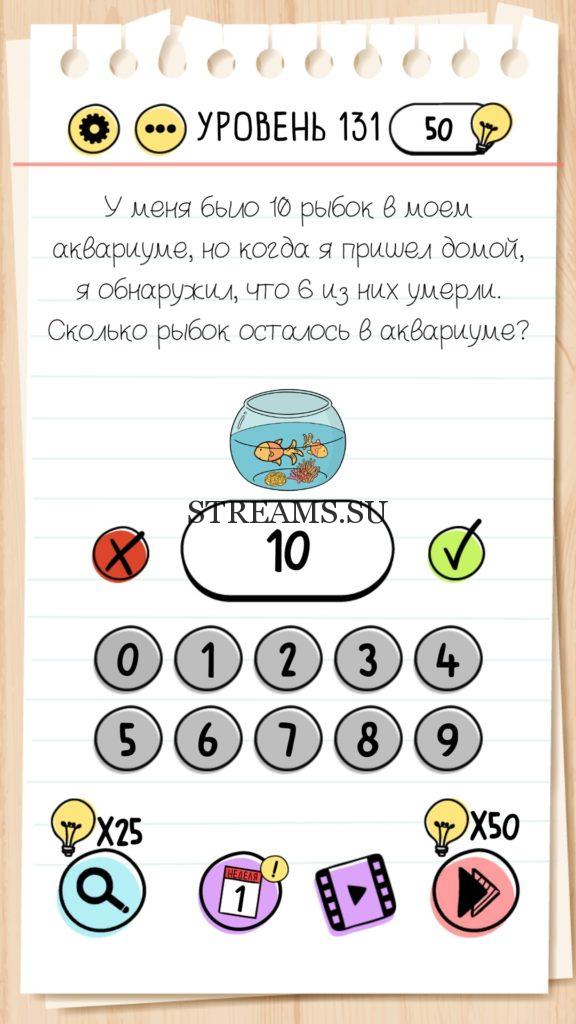 У меня было 10 рыбок в моем аквариуме, но когда я пришел домой, я обнаружил, что 6 из них умерли. Сколько рыбок осталось в аквариуме? Уровень 131 — Brain Test— Это самая популярная головоломка, в которой вам предстоит разгадывать непростые задачки. Нужно будет искать нестандартные решения. Название игры говорит само за себя (Тест мозга). С её помощью вы сможете повысить свой IQ, и интеллект. Иногда ответ может быть очень прост. Вы можете играть в компании друзей или родных. Брейн Тест, это отличный способ провести время с пользой и узнать насколько ты умный. Но если вы не можете решить один или несколько уровней, то воспользуйтесь подсказками с нашего сайта.