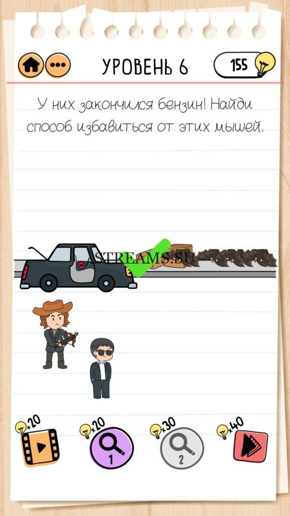 У них закончился бензин! Найди способ избавиться от этих мышей. Уровень 6 — Brain Test 2 (Беймс Джонд и Ваня. Часть 2): Вторая часть замечательной игры уже здесь. Готовы к испытанию своего мозга на прочность? Тогда смело залетайте в эту головоломку. Здесь нас ждет непредсказуемые задачки, вопросы и головоломки, которые сразу и не получиться решить. Будьте готовы к вопросам с подвохом! Попробуйте решить все уровни. Эта головоломка построена по принципу историй. В каждой истории придется помогать кому-то решить бытовые вопросы; вычислить преступника; помочь похудеть. Это лишь некоторые эпизоды которые нас ожидают в этой игре. Очень красочная игра, которая понравится и вам и вашим друзьям. Если не получается пройти загадку, то на нашем сайте STREAMS.SU вы найдете решение любого уровня Brain Test 2!
