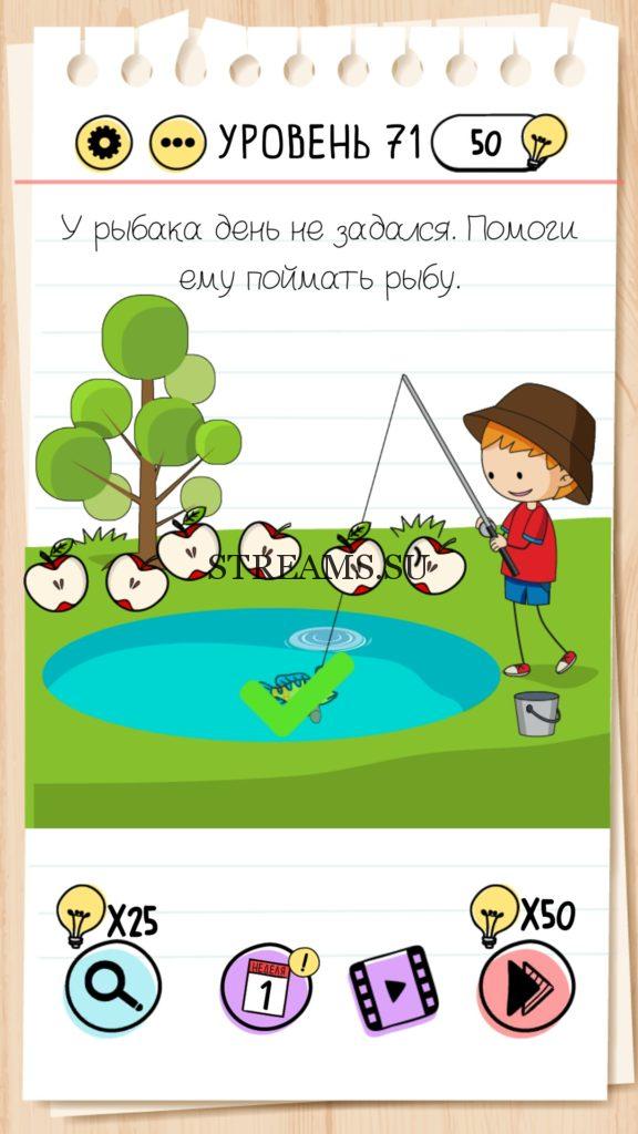 У рыбака день не задался. Помоги ему поймать рыбу. Уровень 71 — Brain Test — Это самая популярная головоломка, в которой вам предстоит разгадывать непростые задачки. Нужно будет искать нестандартные решения. Название игры говорит само за себя (Тест мозга). С её помощью вы сможете повысить свой IQ, и интеллект. Иногда ответ может быть очень прост. Вы можете играть в компании друзей или родных. Брейн Тест, это отличный способ провести время с пользой и узнать насколько ты умный. Но если вы не можете решить один или несколько уровней, то воспользуйтесь подсказками с нашего сайта.