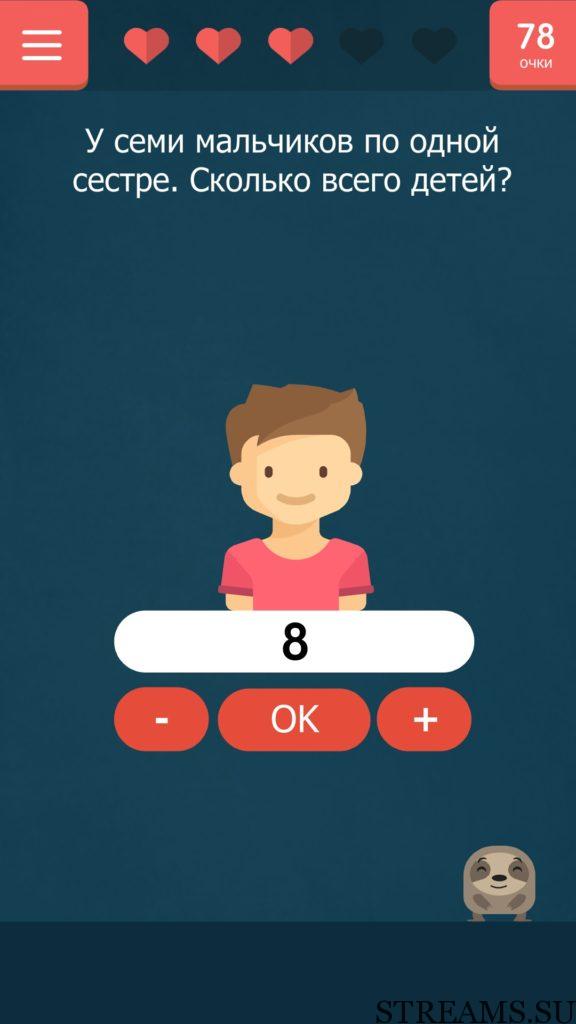 У семи мальчиков по одной сестре. Сколько всего детей? 35 уровень Каверзный тест (Tricky test) — игра от разработчиков студии NatGames. Если вам надоели наивные и простые задачки и головоломки, то эта игра определенно для вас! Нужно будет трясти, переворачивать, гладить свой телефон, чтобы пройти уровень. В описании игры написано, что 94% скачавших, не пройдут игру с первого раза. Чтобы исправить этот процент в меньшую сторону, мы предоставляем вам ответы на все уровни игры.