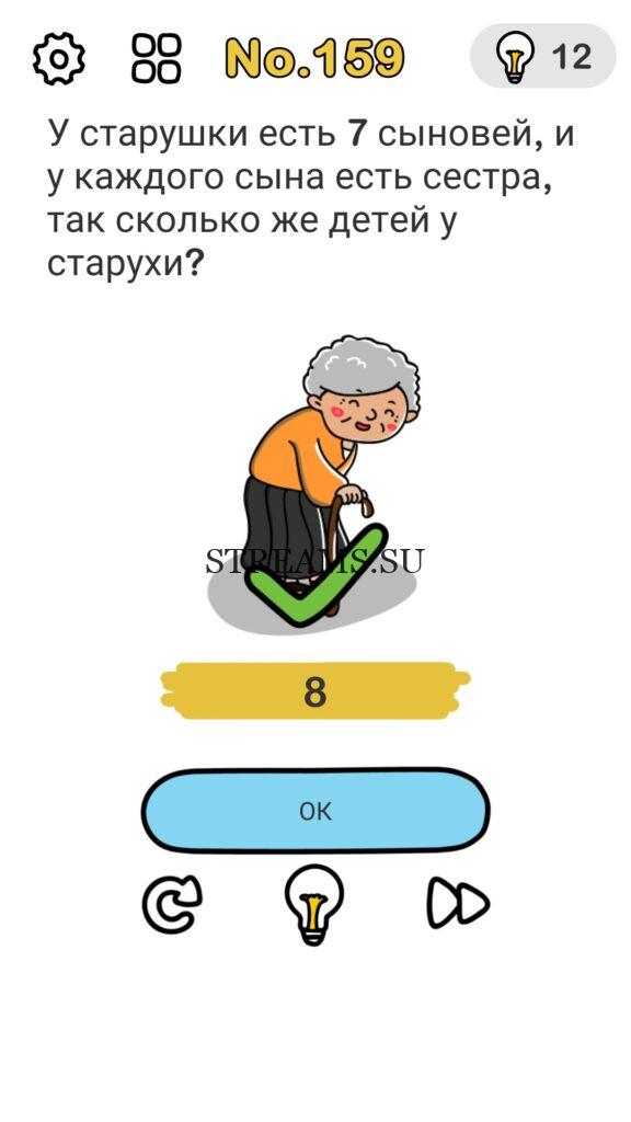 У старушки есть 7 сыновей, и у каждого сына есть сестра, так сколько же детей у старухи? Уровень 159 — Brain Out: Ответ на этот уровень находится чуть ниже. Всегда было интересно узнать каков твой IQ? Эта игра поможет тебе узнать ответ на этот вопрос! В ней встречаются как логические загадки, так и не очень. С помощью этой интересной головоломки вы сможете развить нестандартное мышление, креативность, воображение а также улучшить способность запоминать. Некоторые решения задач, могут показаться абсурдными. Играйте в Brain Out с друзьями и родственниками. А если у вас не получается пройти один или несколько уровней, вы можете воспользоваться подсказками с нашего сайта.