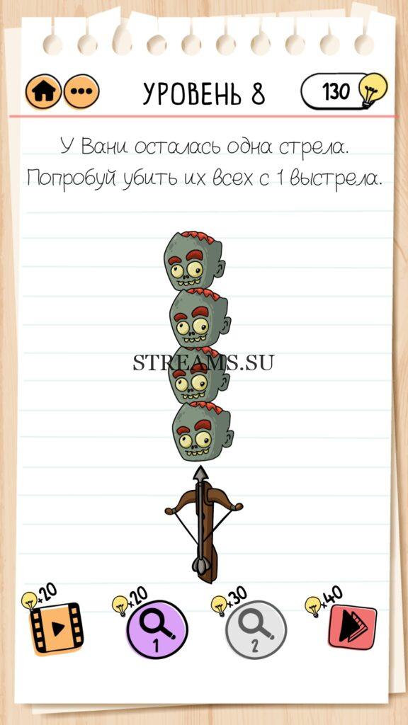 У Вани осталась одно стрела. Попробуй убить их всех с 1 выстрела. Уровень 8 — Brain Test 2 (Охотник на монстров Ваня): Вторая часть замечательной игры уже здесь. Готовы к испытанию своего мозга на прочность? Тогда смело залетайте в эту головоломку. Здесь нас ждет непредсказуемые задачки, вопросы и головоломки, которые сразу и не получиться решить. Будьте готовы к вопросам с подвохом! Попробуйте решить все уровни. Эта головоломка построена по принципу историй. В каждой истории придется помогать кому-то решить бытовые вопросы; вычислить преступника; помочь похудеть. Это лишь некоторые эпизоды которые нас ожидают в этой игре. Очень красочная игра, которая понравится и вам и вашим друзьям. Если не получается пройти загадку, то на нашем сайте STREAMS.SU вы найдете решение любого уровня Brain Test 2!
