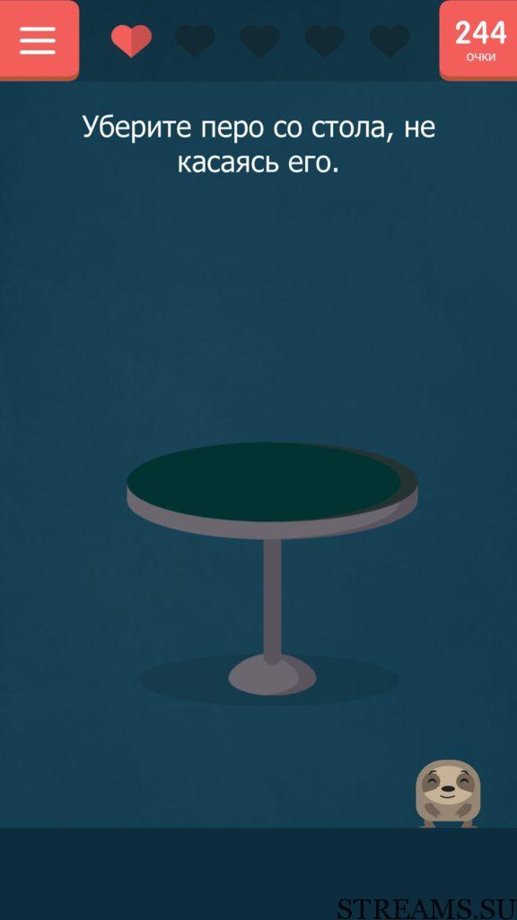 Уберите перо со стола, не касаясь его. 118 уровень Каверзный тест (Tricky test) — игра от разработчиков студии NatGames. Если вам надоели наивные и простые задачки и головоломки, то эта игра определенно для вас! Нужно будет трясти, переворачивать, гладить свой телефон, чтобы пройти уровень. В описании игры написано, что 94% скачавших, не пройдут игру с первого раза. Чтобы исправить этот процент в меньшую сторону, мы предоставляем вам ответы на все уровни игры.
