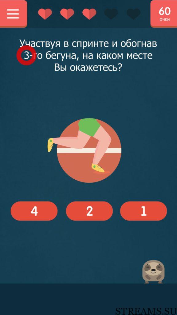 Участвуя в спринте и обогнав 3-го бегуна, на каком месте Вы окажитесь? 26 уровень Каверзный тест (Tricky test) — игра от разработчиков студии NatGames. Если вам надоели наивные и простые задачки и головоломки, то эта игра определенно для вас! Нужно будет трясти, переворачивать, гладить свой телефон, чтобы пройти уровень. В описании игры написано, что 94% скачавших, не пройдут игру с первого раза. Чтобы исправить этот процент в меньшую сторону, мы предоставляем вам ответы на все уровни игры.