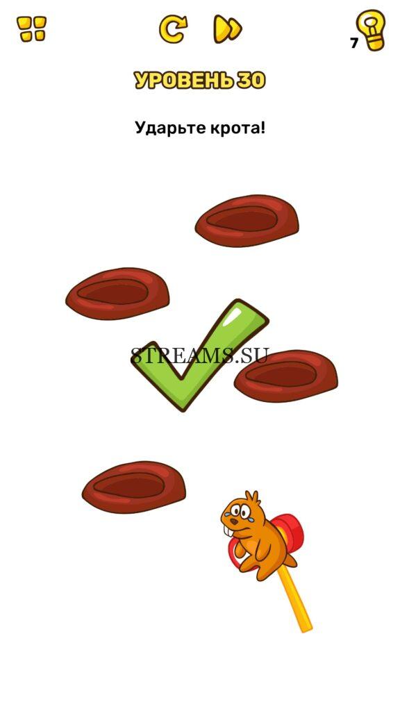 Ударьте крота! Уровень 30 — Brain Blow: Тест на гениальность — Ответ на этот уровень находится под фото. Очередная игра от популярных разработчиков головоломок CASUAL AZUR GAMES. Если вы хотите взорвать свой мозг и развить навыки нестандартного мышления, тогда игра Брейн Блоу определенно вам понравится. Если не получается решить задание, то попробуйте включить нестандартное мышление, тряхнуть телефон, погладить его или использовать больше пальцев. Эта игра способна развить в вас навыки следопыта, креативность и прокачать ваш IQ. Но, а если все-же не получается пройти уровень, найдите правильное решение на нашем сайте.