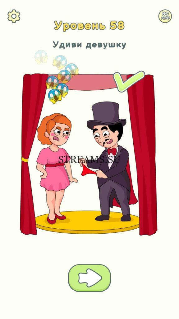 Удиви девушку. Уровень 58 — DOP 2: Delete One Part. Вы готовы к продолжению первой части игры? Тогда вперед! Эта игра DOP 2 (Расшифровка: Delete One Part) , которая отличается от первой части тем, что здесь нам нужно будет не дорисовывать предметы, а удалять или стирать их. Вас ждет множество хитроумных и интересных уровней. На первом этапе нам будут подсказывать, что нужно удали, но потом становится всё тяжелее и тяжелее решать головоломки. Разработчики постарались сделать игру привлекательной. Геймплей заставит вас просидеть за игрой очень долго. Красивая графика исполнения. Тренировка мозга и многое другое, всё это ждет нас в замечательной головоломке DOP 2. Если не получается пройти уровень, или зашли в тупик, то вы можете найти ответ на любой уровень на нашем сайте STREAMS.SU! Ответ на этот уровень находиться чуть ниже..