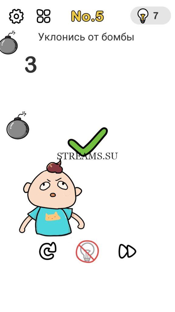 Уклонись от бомбы. (Победи их всех) Уровень 5 — Brain Out: Ответ на этот уровень находится чуть ниже. Всегда было интересно узнать каков твой IQ? Эта игра поможет тебе узнать ответ на этот вопрос! В ней встречаются как логические загадки, так и не очень. С помощью этой интересной головоломки вы сможете развить нестандартное мышление, креативность, воображение а также улучшить способность запоминать. Некоторые решения задач, могут показаться абсурдными. Играйте в Brain Out с друзьями и родственниками. А если у вас не получается пройти один или несколько уровней, вы можете воспользоваться подсказками с нашего сайта.