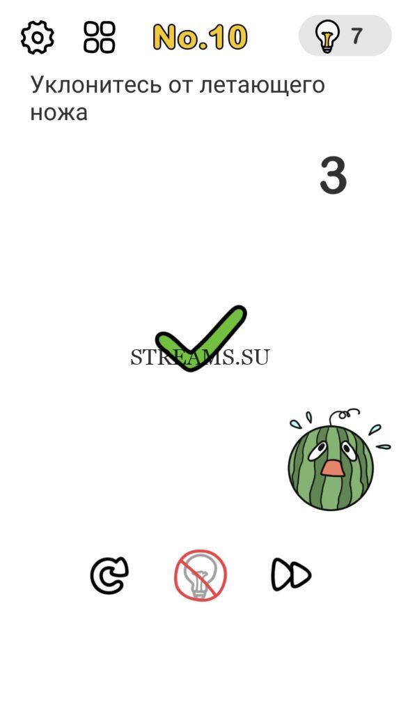 Уклонитесь от летающего ножа. (Победи их всех) Уровень 10 — Brain Out: Ответ на этот уровень находится чуть ниже. Всегда было интересно узнать каков твой IQ? Эта игра поможет тебе узнать ответ на этот вопрос! В ней встречаются как логические загадки, так и не очень. С помощью этой интересной головоломки вы сможете развить нестандартное мышление, креативность, воображение а также улучшить способность запоминать. Некоторые решения задач, могут показаться абсурдными. Играйте в Brain Out с друзьями и родственниками. А если у вас не получается пройти один или несколько уровней, вы можете воспользоваться подсказками с нашего сайта.