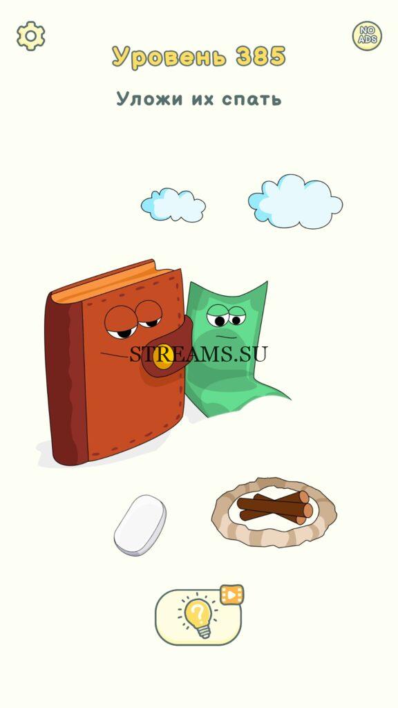Уложи их спать. Уровень 385 — DOP 2: Delete One Part. Вы готовы к продолжению первой части игры? Тогда вперед! Эта игра DOP 2 (Расшифровка: Delete One Part) , которая отличается от первой части тем, что здесь нам нужно будет не дорисовывать предметы, а удалять или стирать их. Вас ждет множество хитроумных и интересных уровней. На первом этапе нам будут подсказывать, что нужно удали, но потом становится всё тяжелее и тяжелее решать головоломки. Разработчики постарались сделать игру привлекательной. Геймплей заставит вас просидеть за игрой очень долго. Красивая графика исполнения. Тренировка мозга и многое другое, всё это ждет нас в замечательной головоломке DOP 2. Если не получается пройти уровень, или зашли в тупик, то вы можете найти ответ на любой уровень на нашем сайте STREAMS.SU! Ответ на этот уровень находиться чуть ниже..