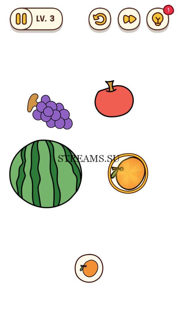 Уровень 3 — Brain Find – уникальная игра в жанре «головоломка», ответ находится чуть ниже. Она имеет множество уровней и подуровней, которые весело проходить, без особых усилий и траты нервов. Игра нравится многим пользователям из-за приятного музыкального ряда, сопровождающегося весь игровой процесс. Тонко выполненной анимации и красивой графики, над которой поработали разработчики и вложили душу. Уникальность проекта состоит в том, что можно поворачивать экран на некоторых заданиях, увеличивать громкость динамика. То есть, всецело взаимодействовать не только с дисплеем, но и со всем мобильным устройством. На данный момент таких игр мало и не все они доступны в бесплатной версии! Brain Find переведена на русский язык. На нашем сайте, можно получить подсказки, если не получается пройти дальше.