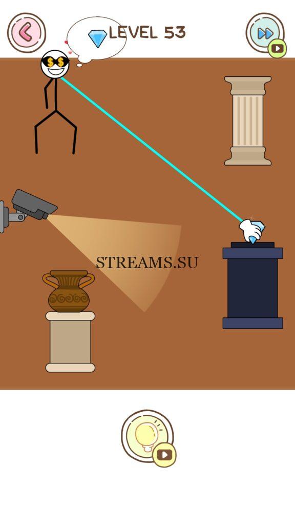 LEVEL 53 — Thief Puzzle — Интересная и веселая головоломка в которой нам нужно будет «красть» различные вещи. Но делать это так, чтобы нас не поймали. Эта игра не призывает к воровству. Нужно продумать план, чтобы завершить уровень. В основном первые уровни не так сложны как последующие. Здесь придется поднапрячь извилины и использовать свою смекалку. Нам придется проводить руку через различные места (рука у нас будет очень длинная), чтобы достичь бесхозного портфеля, кошелька, и т.д. Игра увлекает, и можно просидеть за ней часами не заметив как проходит время. Бывают такие уровни, что не получается, что-то украсть незаметно! Тогда на помощь приходит наш замечательный сайт с ответами на все уровни!