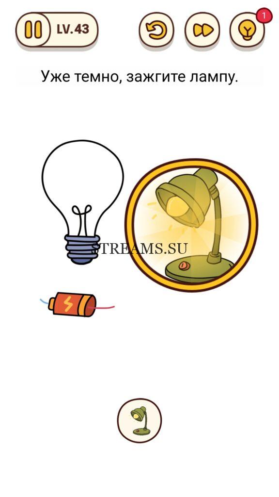 Уже темно, зажгите лампу. Уровень 43 — Brain Find – игра для любителей подумать над интересными задачами, ответ на этот уровень находится чуть ниже. Нужно включить собственное остроумие. Эта игра дает возможность увидеть множество локаций и разгадать бесконечное количество ребусов. Каждый отличается друг от друга. Создатели игры – «Focus apps» вложили не только материальные средства, но и всю любовь к игрокам. Ведь в приложении достаточно совершенная прорисовка, радующая глаз. Главным преимуществом является поддержка как Android так и IOS. Нередко бывает, что человек, проходящий уровень, не способен его решить (задача слишком сложна или непонятна). Наш сайт с ответами поможет игроку достичь вершин рейтинга и заполучить все бонусы.