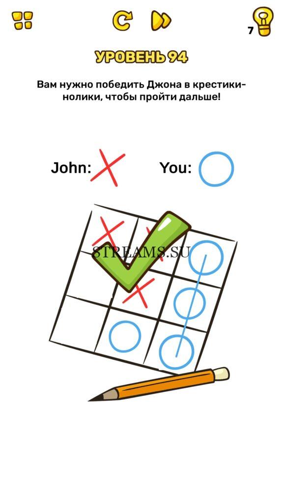 Вам нужно победить Джона в крестики-нолики, чтобы пройти дальше! Уровень 94 — Brain Blow: Тест на гениальность — Ответ на этот уровень находится под фото. Очередная игра от популярных разработчиков головоломок CASUAL AZUR GAMES. Если вы хотите взорвать свой мозг и развить навыки нестандартного мышления, тогда игра Брейн Блоу определенно вам понравится. Если не получается решить задание, то попробуйте включить нестандартное мышление, тряхнуть телефон, погладить его или использовать больше пальцев. Эта игра способна развить в вас навыки следопыта, креативность и прокачать ваш IQ. Но, а если все-же не получается пройти уровень, найдите правильное решение на нашем сайте.