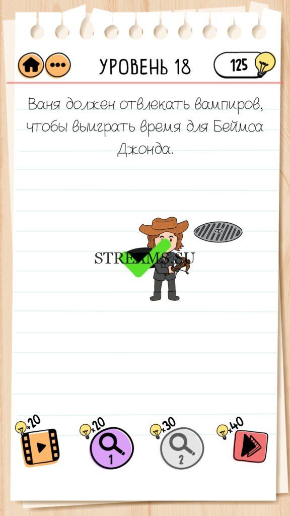 Ваня должен отвлекать вампиров, чтобы выиграть время для Беймса Джонда. Уровень 18 — Brain Test 2: Вторая часть замечательной игры уже здесь. Готовы к испытанию своего мозга на прочность? Тогда смело залетайте в эту головоломку. Здесь нас ждет непредсказуемые задачки, вопросы и головоломки, которые сразу и не получиться решить. Будьте готовы к вопросам с подвохом! Попробуйте решить все уровни. Эта головоломка построена по принципу историй. В каждой истории придется помогать кому-то решить бытовые вопросы; вычислить преступника; помочь похудеть. Это лишь некоторые эпизоды которые нас ожидают в этой игре. Очень красочная игра, которая понравится и вам и вашим друзьям. Если не получается пройти загадку, то на нашем сайте STREAMS.SU вы найдете решение любого уровня Brain Test 2!