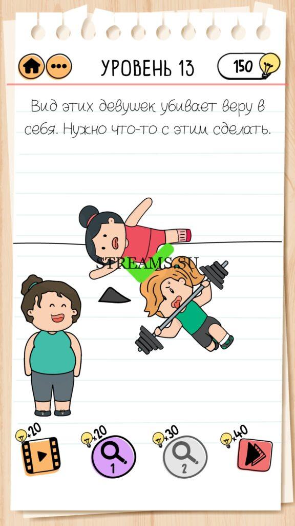Вид этих девушек убивает веру в себя. Нужно что-то с этим делать. Уровень 13 — Brain Test 2 (Худеем с Настей): Вторая часть замечательной игры уже здесь. Готовы к испытанию своего мозга на прочность? Тогда смело залетайте в эту головоломку. Здесь нас ждет непредсказуемые задачки, вопросы и головоломки, которые сразу и не получиться решить. Будьте готовы к вопросам с подвохом! Попробуйте решить все уровни. Эта головоломка построена по принципу историй. В каждой истории придется помогать кому-то решить бытовые вопросы; вычислить преступника; помочь похудеть. Это лишь некоторые эпизоды которые нас ожидают в этой игре. Очень красочная игра, которая понравится и вам и вашим друзьям. Если не получается пройти загадку, то на нашем сайте STREAMS.SU вы найдете решение любого уровня Brain Test 2!