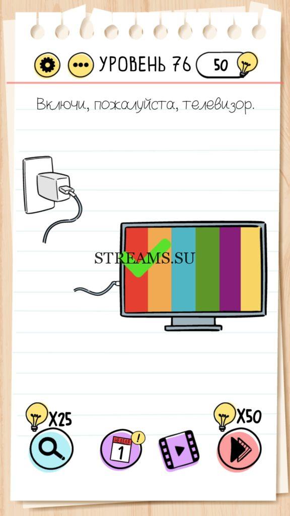 Включи, пожалуйста, телевизор. Уровень 76 — Brain Test — Это самая популярная головоломка, в которой вам предстоит разгадывать непростые задачки. Нужно будет искать нестандартные решения. Название игры говорит само за себя (Тест мозга). С её помощью вы сможете повысить свой IQ, и интеллект. Иногда ответ может быть очень прост. Вы можете играть в компании друзей или родных. Брейн Тест, это отличный способ провести время с пользой и узнать насколько ты умный. Но если вы не можете решить один или несколько уровней, то воспользуйтесь подсказками с нашего сайта.