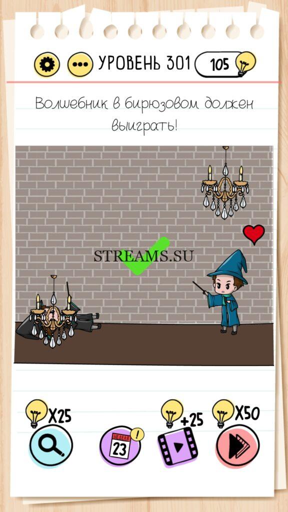 Волшебник в бирюзовом должен выиграть! Уровень 301 — Brain Test — Это самая популярная головоломка, в которой вам предстоит разгадывать непростые задачки. Нужно будет искать нестандартные решения. Название игры говорит само за себя (Тест мозга). С её помощью вы сможете повысить свой IQ, и интеллект. Иногда ответ может быть очень прост. Вы можете играть в компании друзей или родных. Брейн Тест, это отличный способ провести время с пользой и узнать насколько ты умный. Но если вы не можете решить один или несколько уровней, то воспользуйтесь подсказками с нашего сайта.