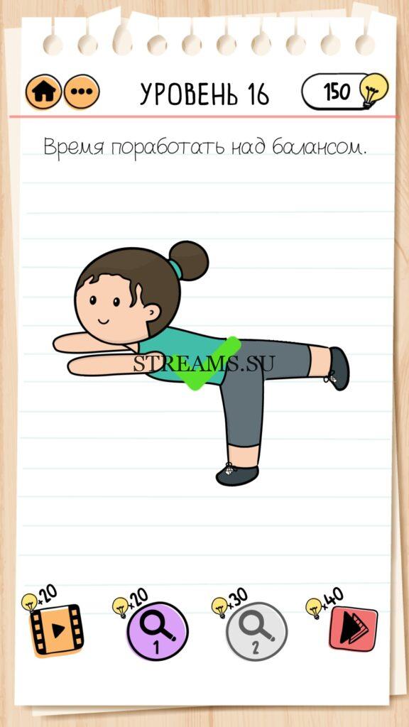 Время поработать над балансом. Уровень 16 — Brain Test 2 (Худеем с Настей): Вторая часть замечательной игры уже здесь. Готовы к испытанию своего мозга на прочность? Тогда смело залетайте в эту головоломку. Здесь нас ждет непредсказуемые задачки, вопросы и головоломки, которые сразу и не получиться решить. Будьте готовы к вопросам с подвохом! Попробуйте решить все уровни. Эта головоломка построена по принципу историй. В каждой истории придется помогать кому-то решить бытовые вопросы; вычислить преступника; помочь похудеть. Это лишь некоторые эпизоды которые нас ожидают в этой игре. Очень красочная игра, которая понравится и вам и вашим друзьям. Если не получается пройти загадку, то на нашем сайте STREAMS.SU вы найдете решение любого уровня Brain Test 2!