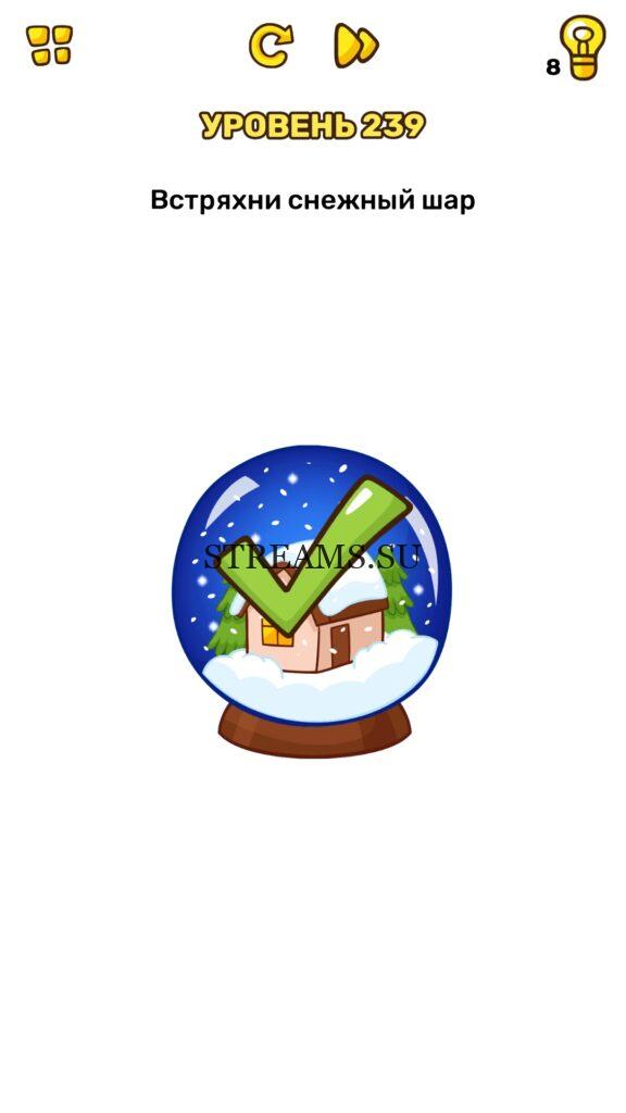 Встряхни снежный шар. Уровень 239 — Brain Blow: Тест на гениальность — Ответ на этот уровень находится под фото. Очередная игра от популярных разработчиков головоломок CASUAL AZUR GAMES. Если вы хотите взорвать свой мозг и развить навыки нестандартного мышления, тогда игра Брейн Блоу определенно вам понравится. Если не получается решить задание, то попробуйте включить нестандартное мышление, тряхнуть телефон, погладить его или использовать больше пальцев. Эта игра способна развить в вас навыки следопыта, креативность и прокачать ваш IQ. Но, а если все-же не получается пройти уровень, найдите правильное решение на нашем сайте.